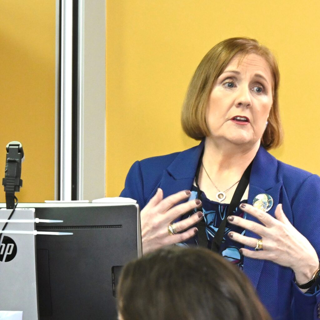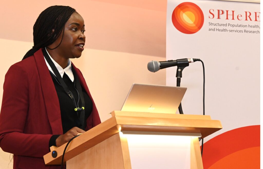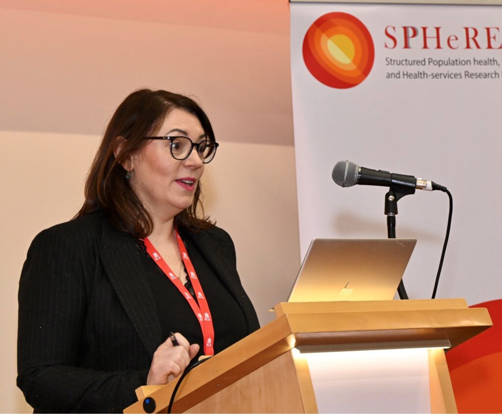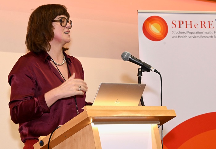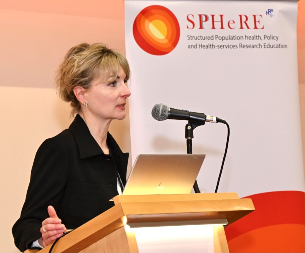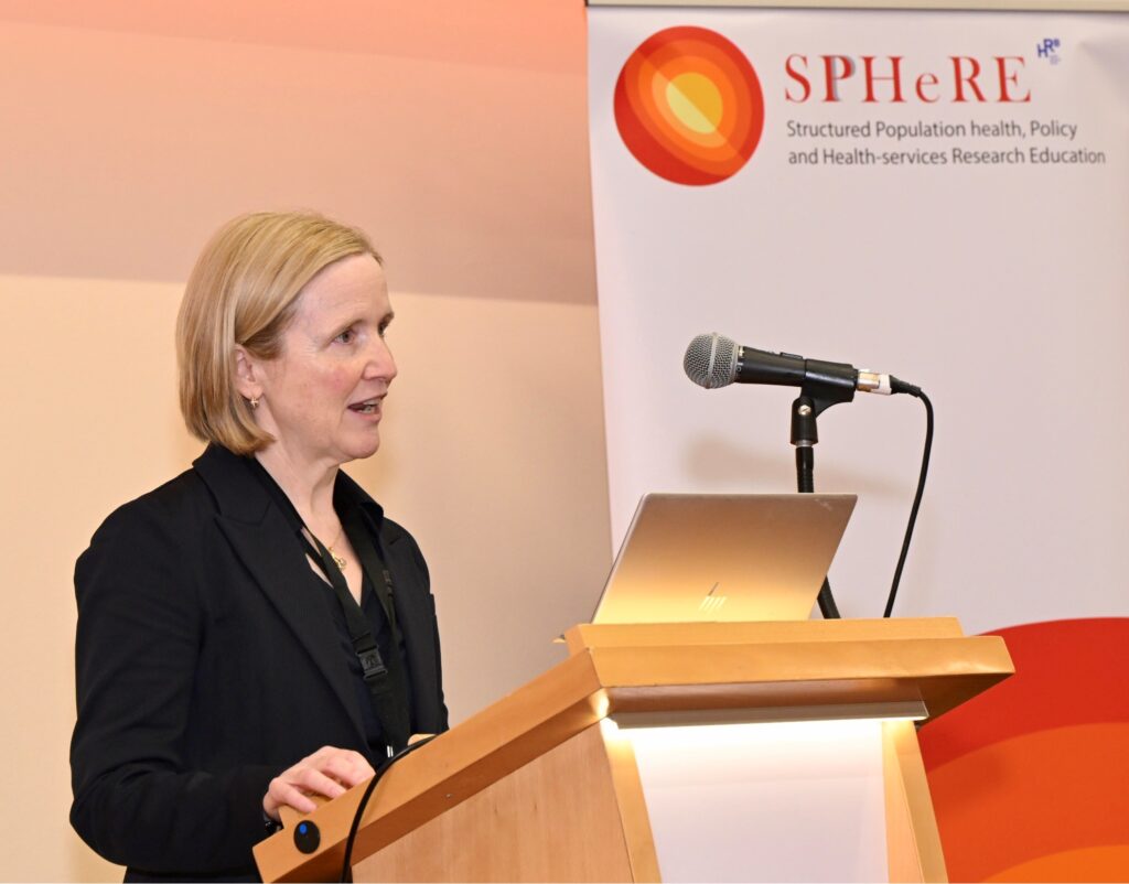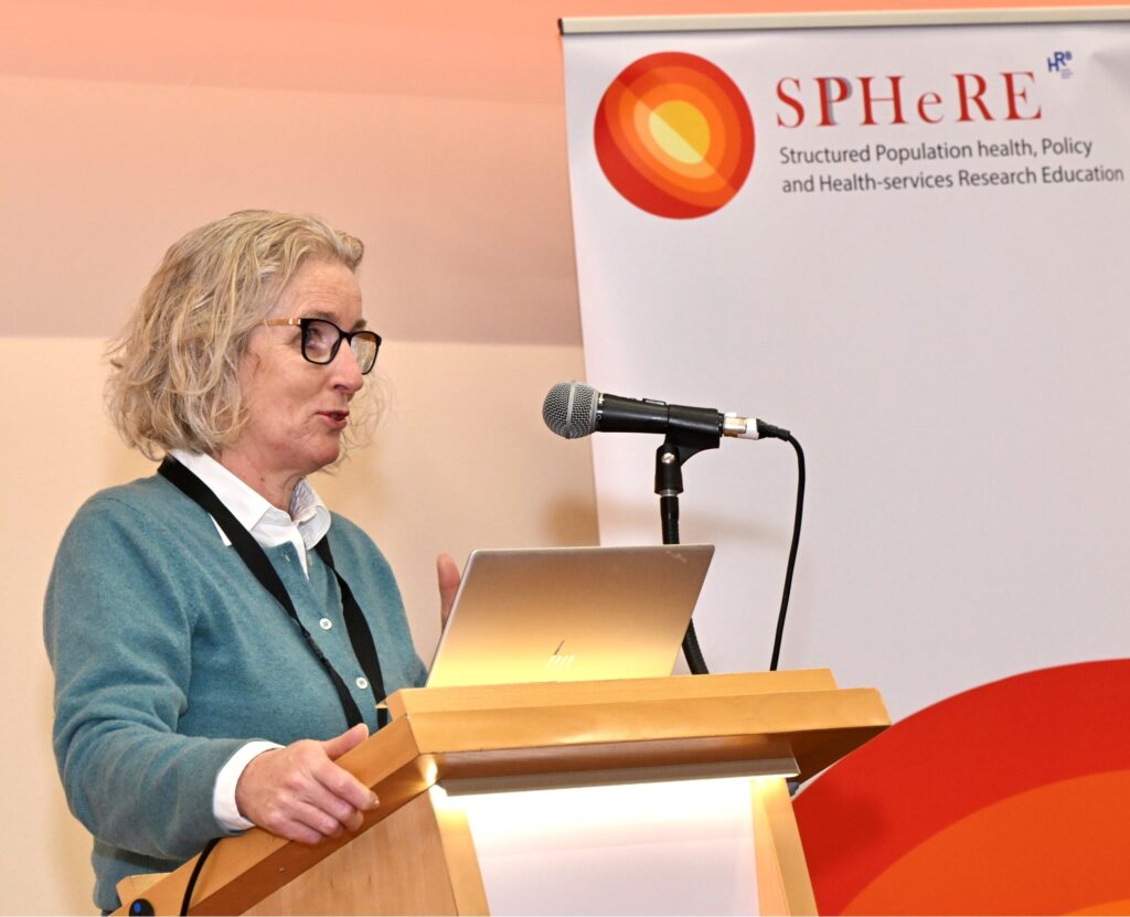 As the keynote speaker at the SPHeRE Network Autumn Seminar 2024, Professor Agnes Higgins, Professor of Mental Health at the School of Nursing & Midwifery, TCD, addresses the audience.